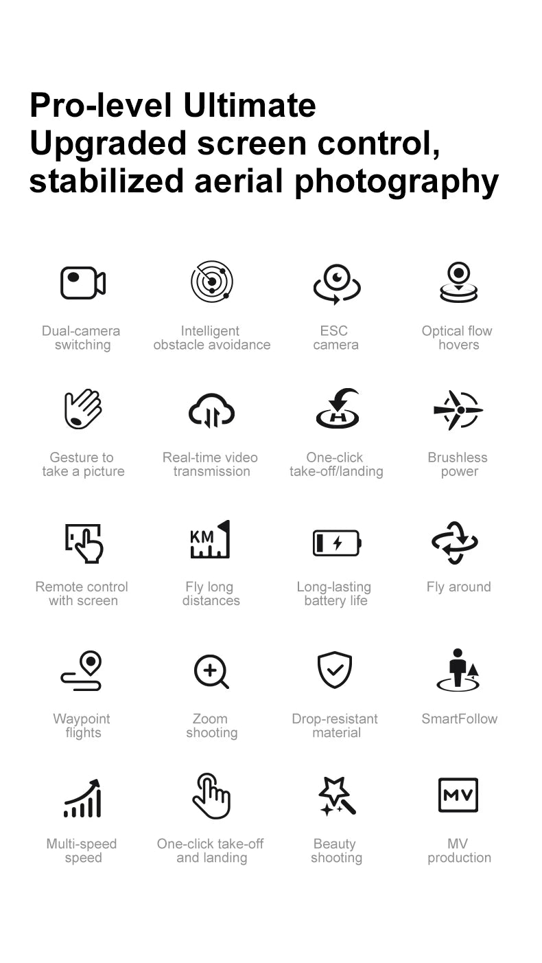 Advanced functions :1. Built-in display 2. Accurate positioning one-key return, low-power return, lost contact return 3. 4.MV recording sharing, gesture photography, gesture video, double camera switching beautiful body 5.ABS high toughness case, super resistance to fall 6. Omnidirectional LED lighting