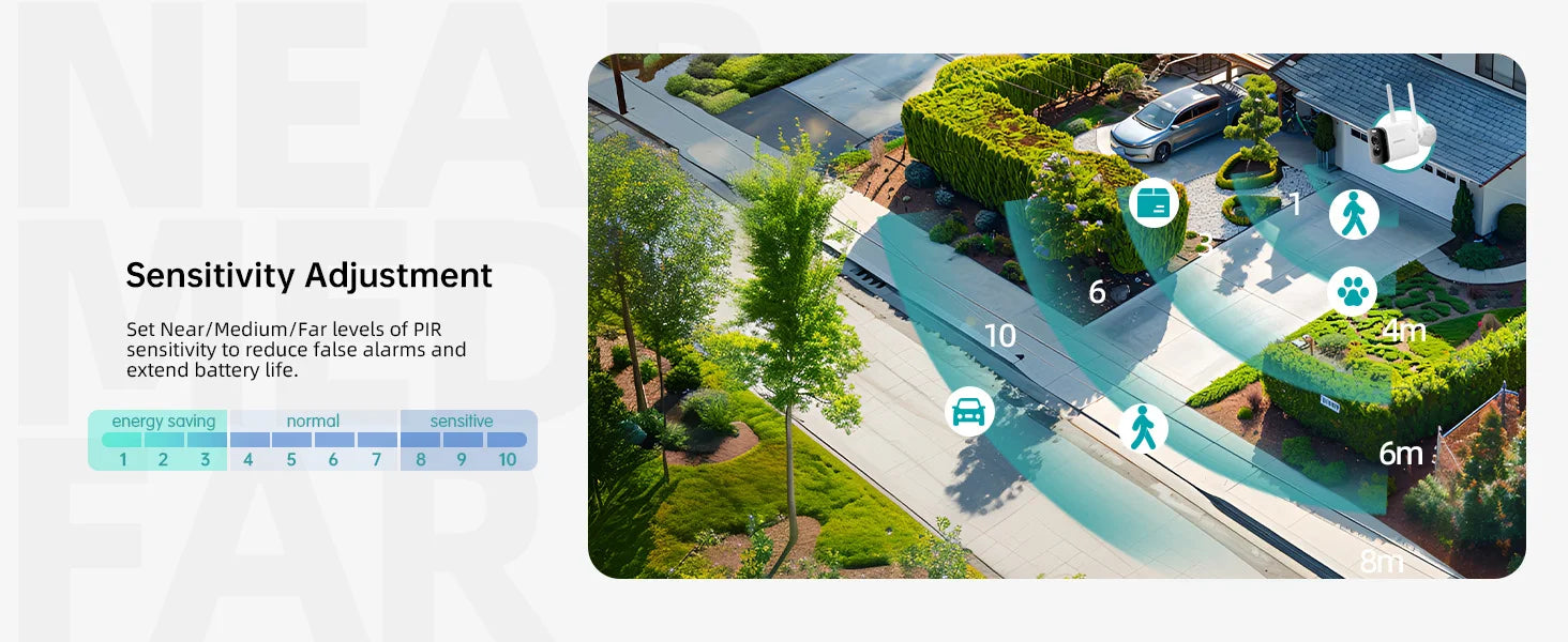 Set Near/Medium/Far levels of PIR sensitivity to reduce false alarms andextend battery life.
